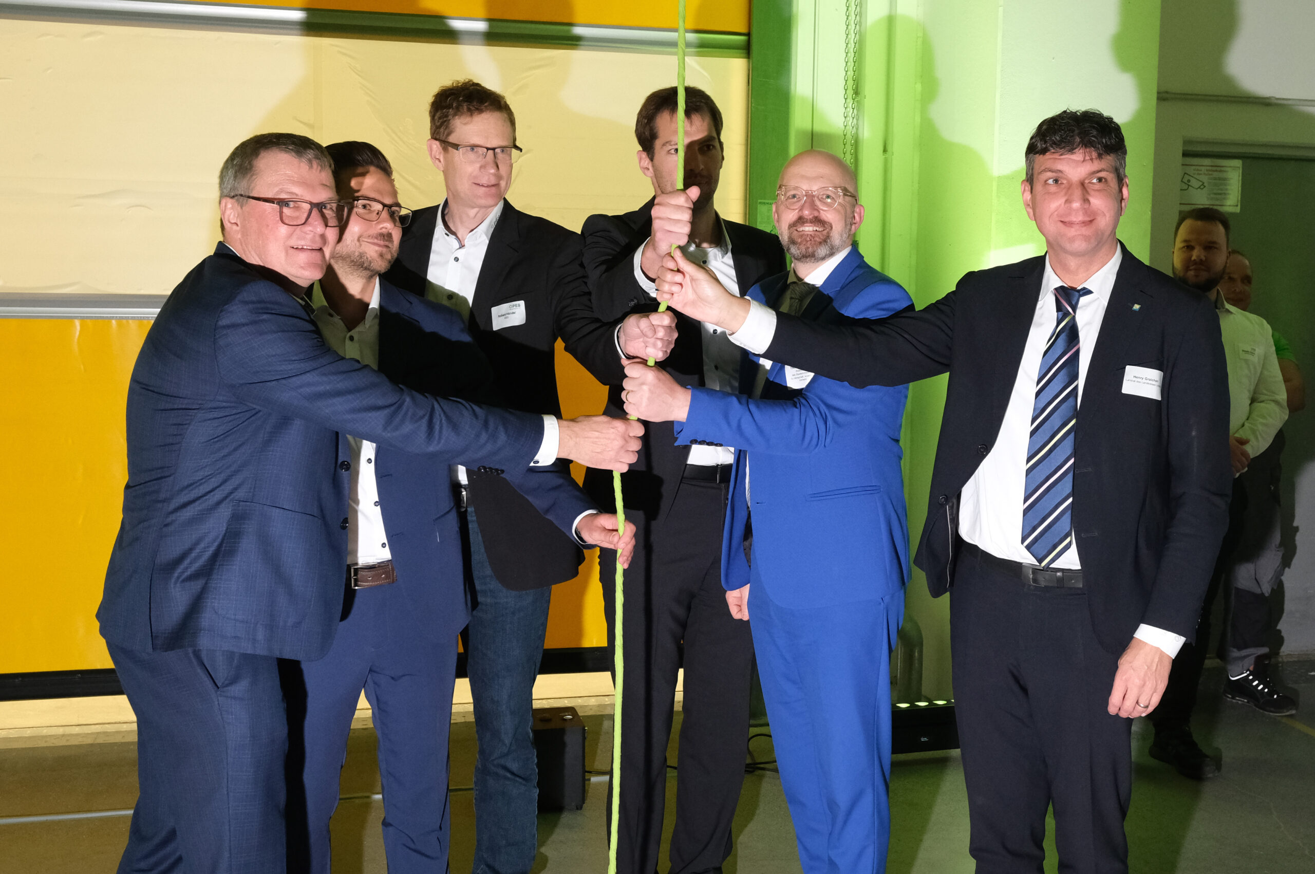 Eröffnung Opes Solar Mobility in Zwenkau bei Leipzig am 23.10.25. V. l. Holger Schulz (Bürgermeister Zwenkau), Werksleiter Alexander Uhle, Geschäftsführer Robert Händel, Staatssekretär Thomas Kralinski (2. v. r.), Landrat Henry Graichen (r). Foto: Sebastian Willnow
